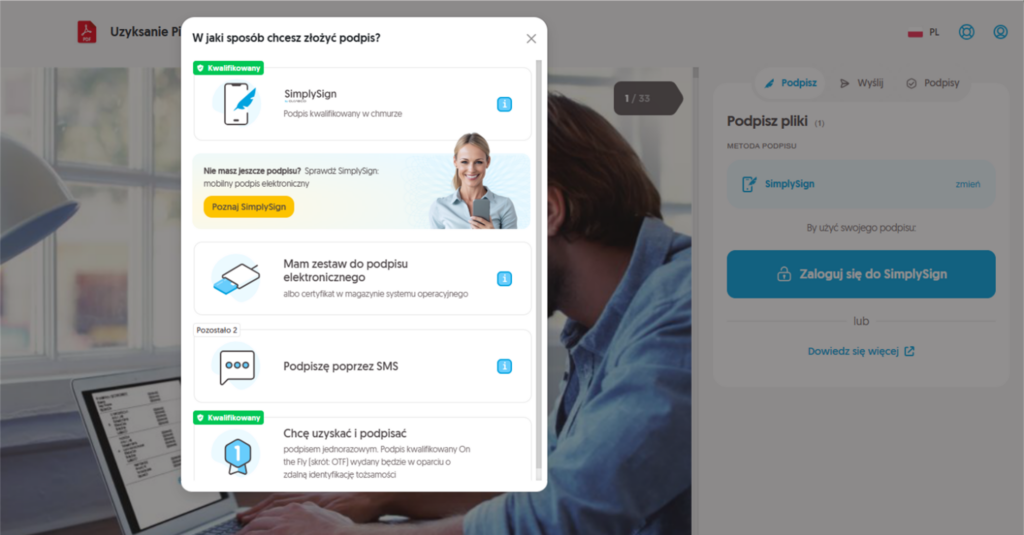 Mobilnego podpisu SimplySign możesz używać do podpisywania elektronicznych dokumentów PDF na cztery sposoby: